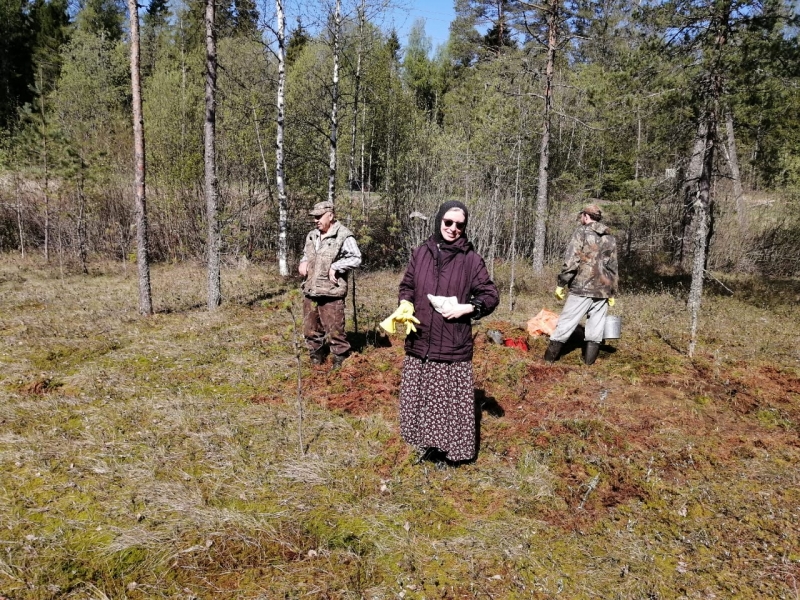 Сегодня в монастыре необычное послушание: занимаемся заготовкой мха на безымянном болоте. Рабочие рубят громадный сруб - будущую трапезную. Сруб состоит из венцов. Венец - это такая конструкция из брёвен, когда они укладываются прямоугольником в «колодец», а концы их скрепляются (зарубаются) друг с другом. Венцы укладываются один на другой и получается сруб нужной высоты. При укладке венцов между брёвен образуются небольшие пустоты. Они заполняются утеплителем. Мох считается лучшим природным утеплителем. Он не гниёт. Мох очень гигроскопичен, укладывают его между венцами влажным, даже специально поливают водой. Дома с таким материалом стоят сотни лет. Звено у нас небольшое, помогают Виталий и Юрий Сергеевич, живущий неподалёку. За старшую - игуменья София. Болотце мы нашли неплохое, таскать ведра недалеко – 70 м. Дёргать мох на первый взгляд просто. На самом деле - труд напряжённый и утомительный. Мох нужен красный и обязательно в мокром месте. Тогда он хорошо дёргается и чистый. Начали мы в 9 часов утра и к 12-ти часам заготовили тонну мха. Ровно столько грузоподъемность автомобиля. Виталий всё перетаскал на коромысле. Теперь можно укладывать первые венцы восстанавливаемой трапезной. Слава Богу.